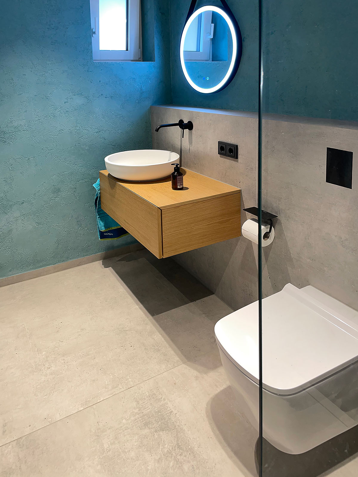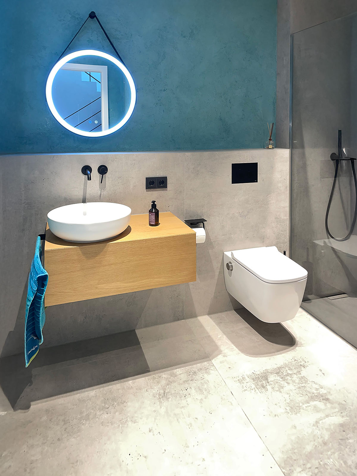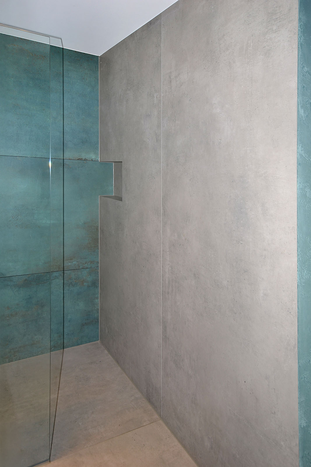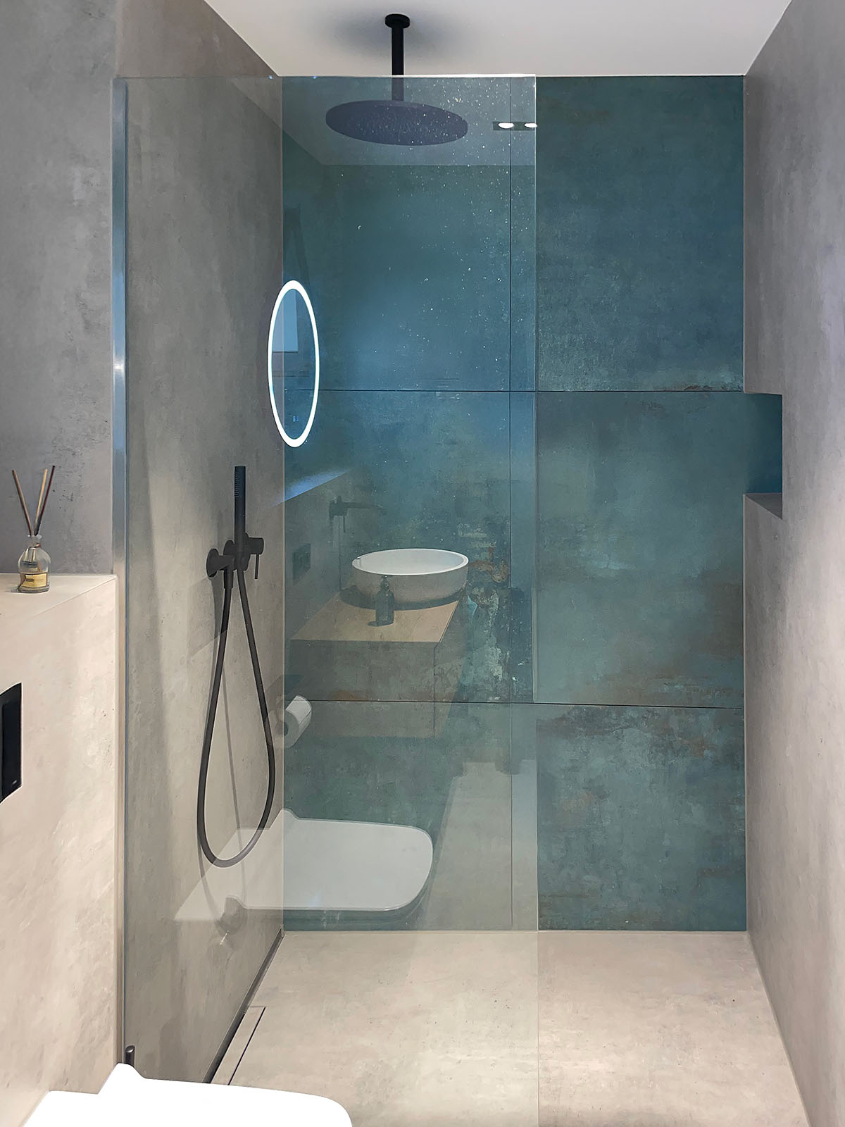 Wände mit großformatigen Feinsteinzeugfliesen 120 x 120 cm, Duschwände mit einer Mega-Großformatfliese 120 x 270 cm und