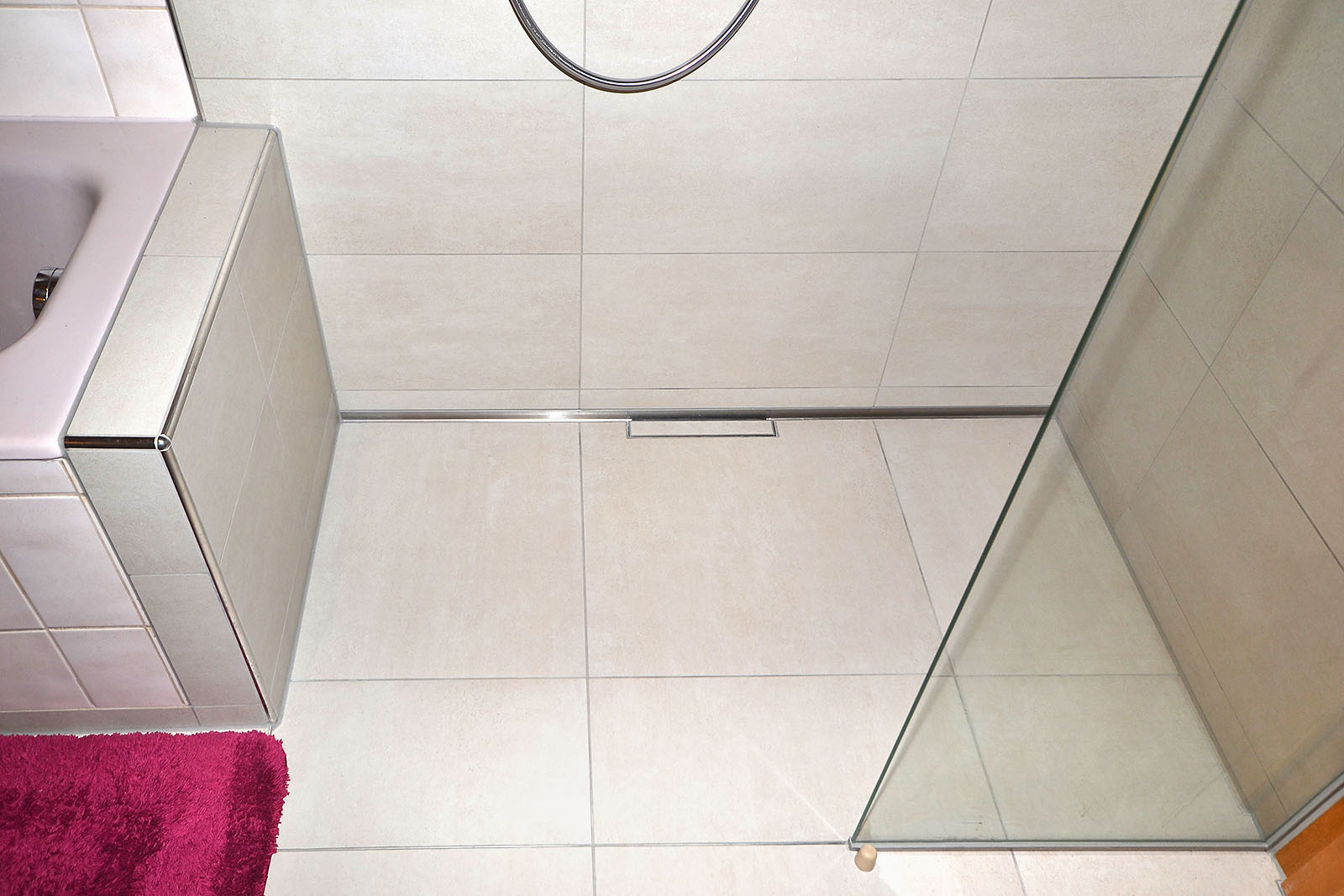 Wandfläche im Duschbereich mit 30 x 60 cm Feinsteinzeugfliesen derselben Serie